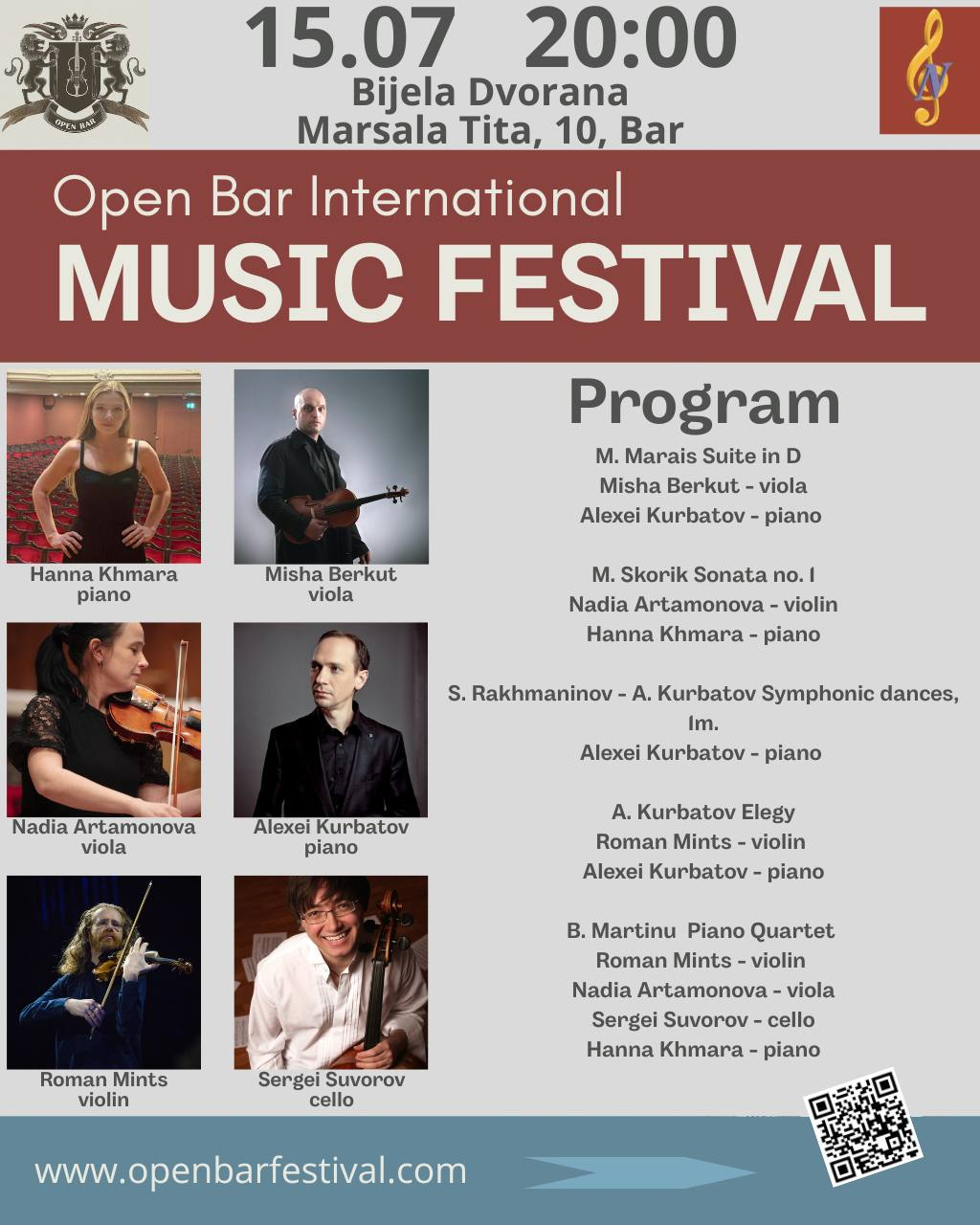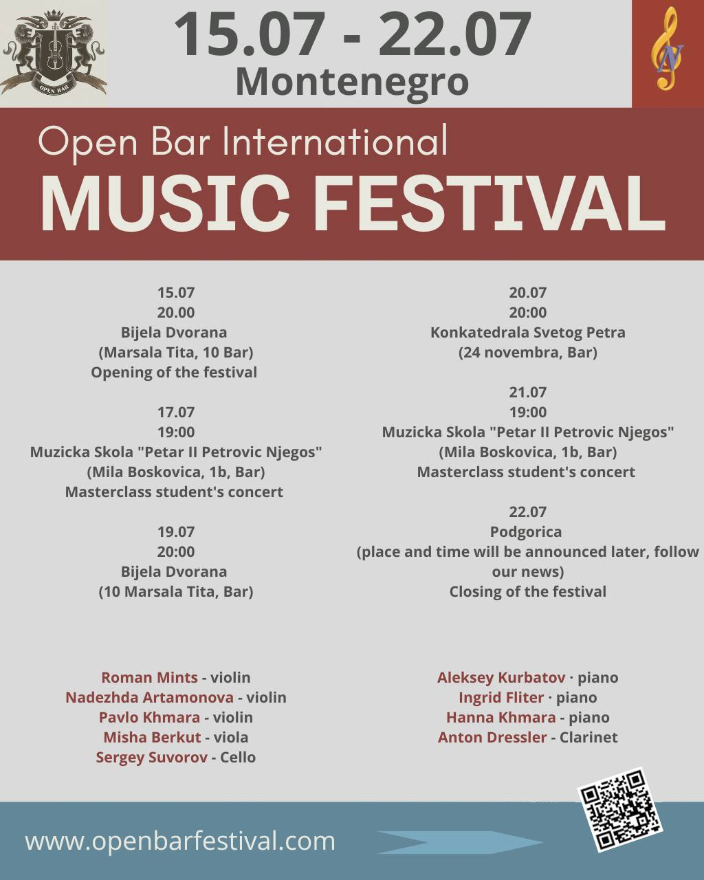 Роман Минц, Ингрид Флитер, Антон Дресслер, Анна Хмара, а также уже полюбившиеся черногорской публике Алексей Курбатов, Надежда Артамонова, Сергей Суворов, Миша Беркут. Рядом со взрослыми, состоявшимися музыкантами также будут играть юные одаренные скрипачи, альтисты и виолончелисты, участники мастер-классов, которые в то же самое время будут проходить в рамках фестиваля.